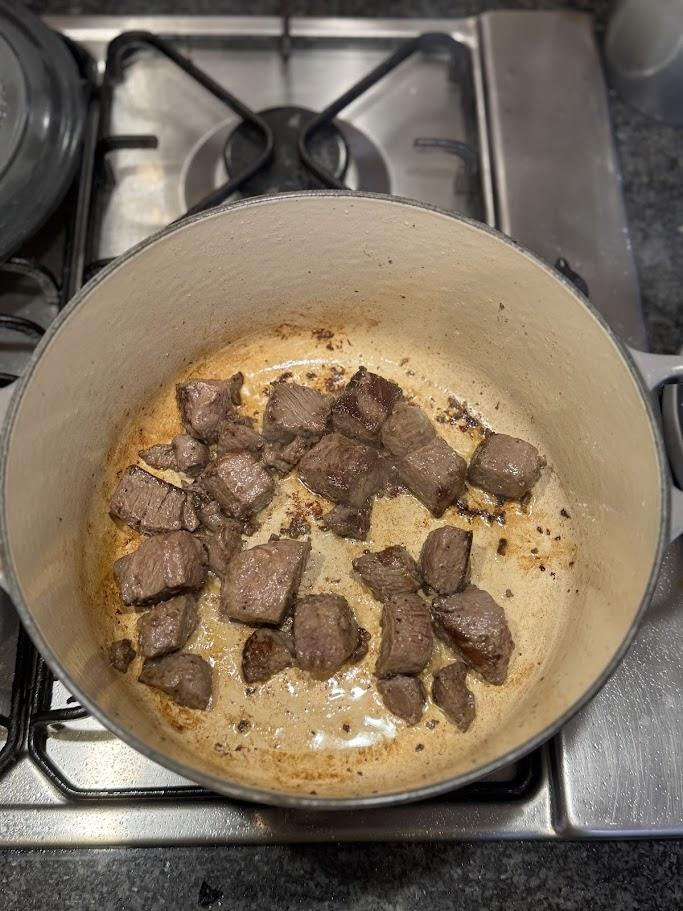 - Sear off the steak chunks in batches, browning nicely all over. Season them with salt and pepper as you sear and set them aside.