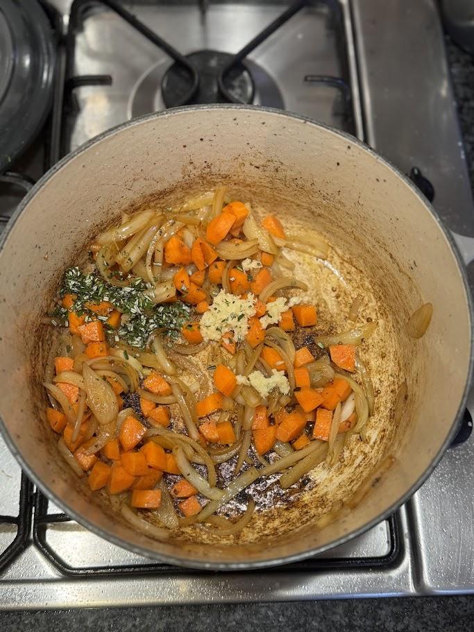 - Mince or grate your garlic and finely chop the rosemary. Add it to the pot and cook until fragrant.