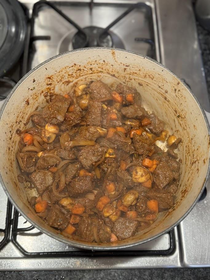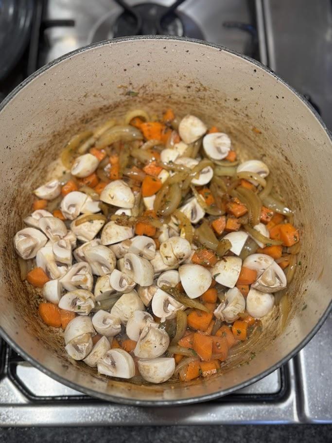 My recipe doesn’t deviate too far from the classic version. It mostly revolves around steak, onions, carrots and button mushrooms. This is then seasoned with salt, pepper and fresh rosemary, and then I like to add some mustard seeds before the vegetables to allow them to fry and pop. This gives a great earthiness and warmth.