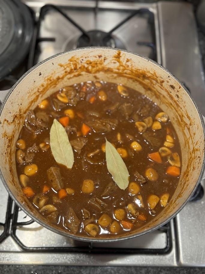 - Pour in the beef stock and add the Worcestershire sauce and bay leaves. Cover and reduce the heat to medium low. Simmer for an hour covered.