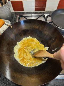 - Add in the egg and immediately start stirring vigorously with a wooden spoon. They will cook quickly and you want them to scramble but not burn or brown yet.