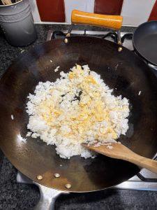 - Once the eggs have begun forming curds but are still a bit runny, add your rice in and use the spoon to mix and break up clumps. Keep tossing it to stop is sticking or burning.