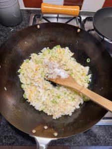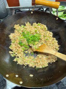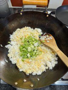 - Add in the sliced spring onion whites and stir more, tossing the rice to stop the rice at the bottom from burning.