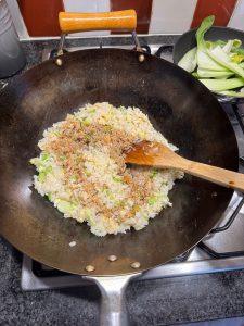 - Cook for a couple of minutes, stirring and tossing regularly. You want to realy fry the rice now and start to crisp up some of the grains and get some caramelisation going!