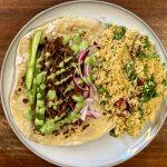 The sauce is nice and easy. It’s a yoghurt based sauce with lemon juice, vinegar, garlic powder and fresh herbs. For this I use coriander, mint and basil. I think these give the best blend of aromatic flavours and mediterranean vibes. It definitely needs more coriander and basil than mint, as this can be overpowering.