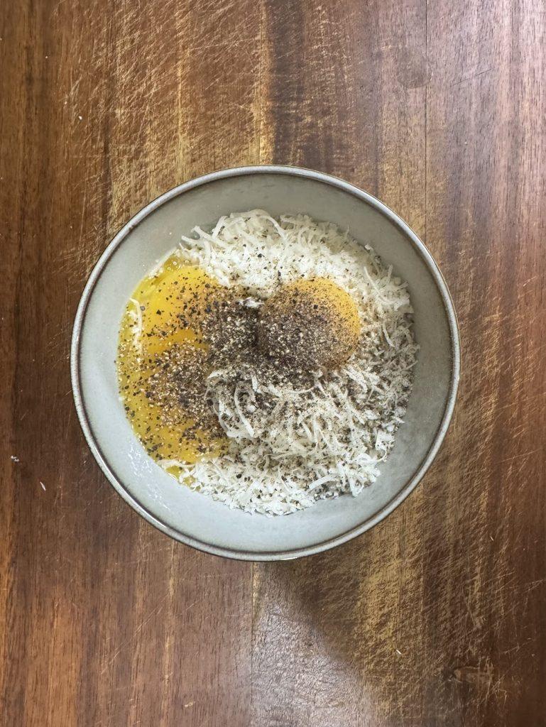 - Grate the pecorino and mix it in a bowl with the egg yolks and ground black pepper.