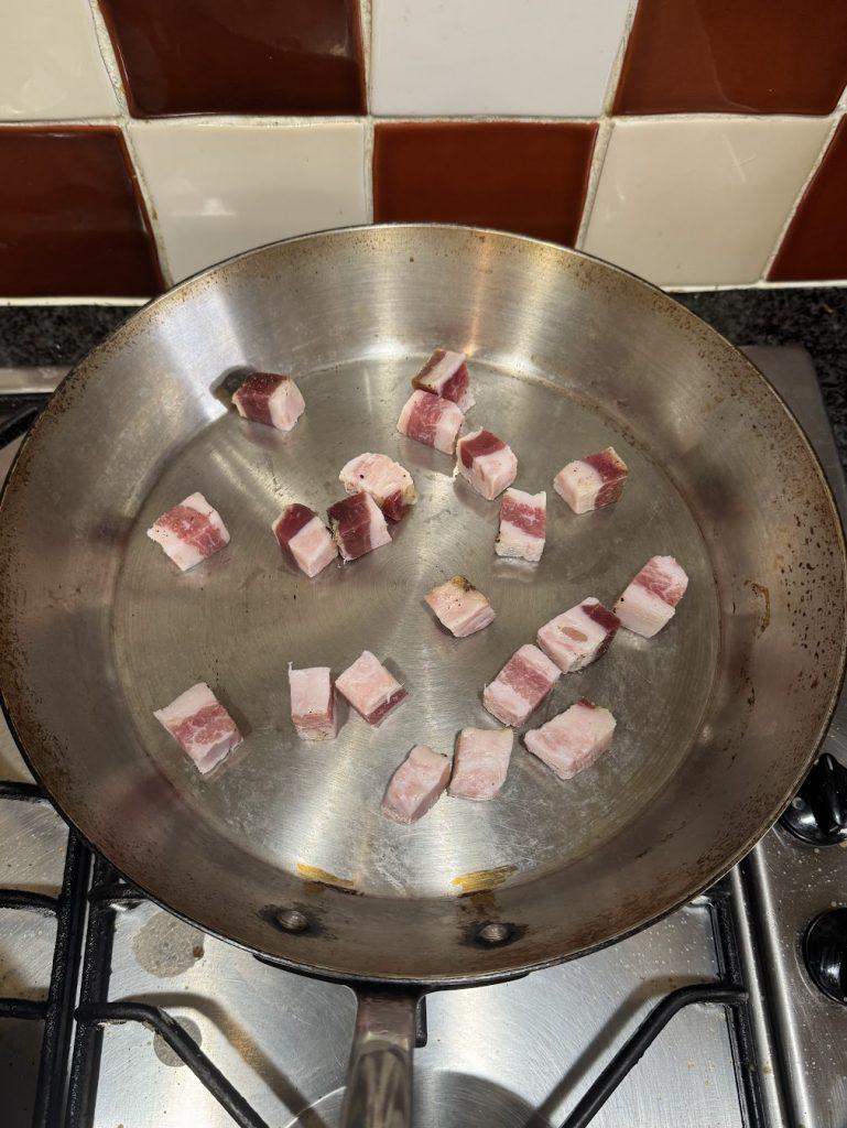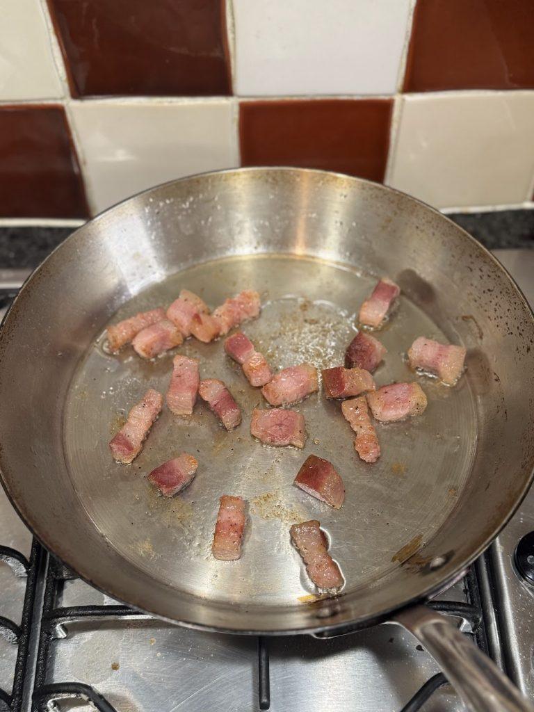 - Remove the guanciale from the pan once cooked and drain off around half of the fat. Turn the heat off.