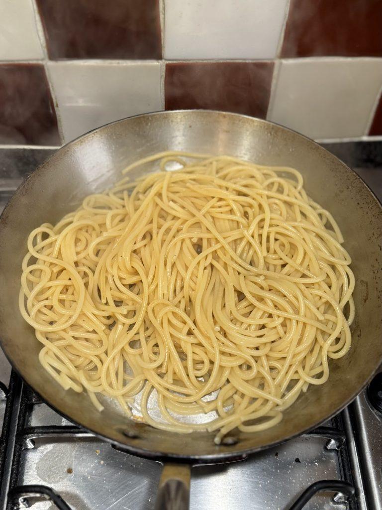 - Once the pasta is ready, remove it from the water and add it straight into the guanciale pan. Toss the pasta in the remaining fat to coat evenly.