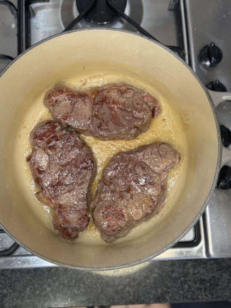 - Season your beef shin generously with salt and sear it on both sides until browned. Remove and set aside.