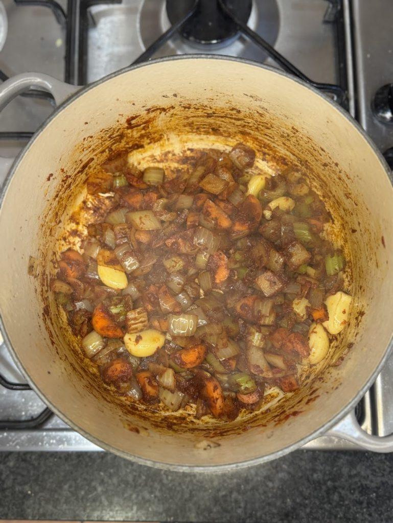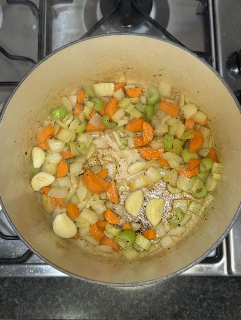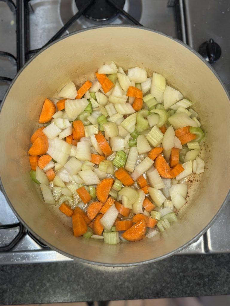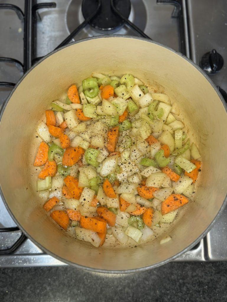 - Roughly chop your carrot, onion and celery and add them to the pot. Cook for 3-5 minutes, until softened. Season generously with salt and black pepper.