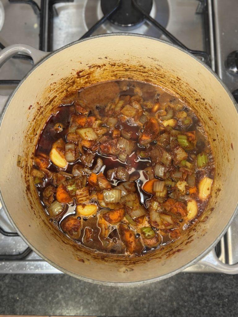 The bulk of the sauce is beef stock. A good quality beef stock will bring a really punchy, meaty flavour and bind everything together! Finally, I have seasoned this with a bit of nutmeg and allspice. They complement the earthiness of the wine and overall richness of the dish really well!