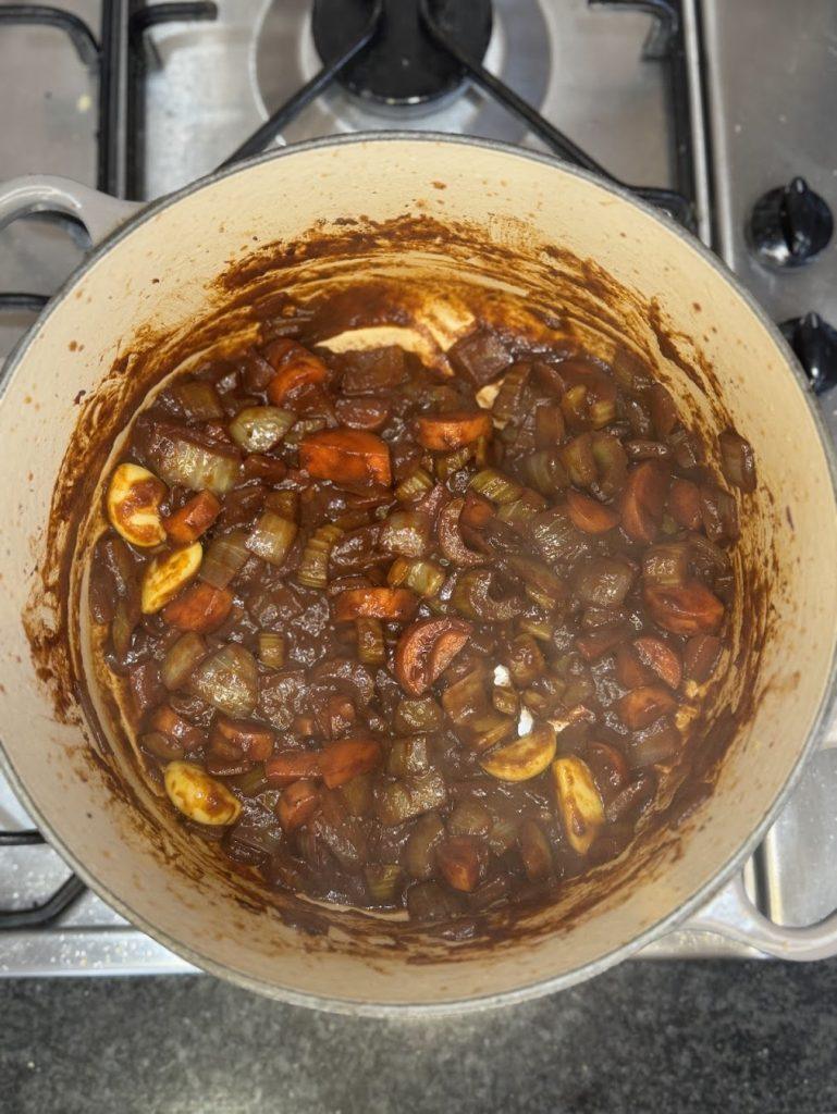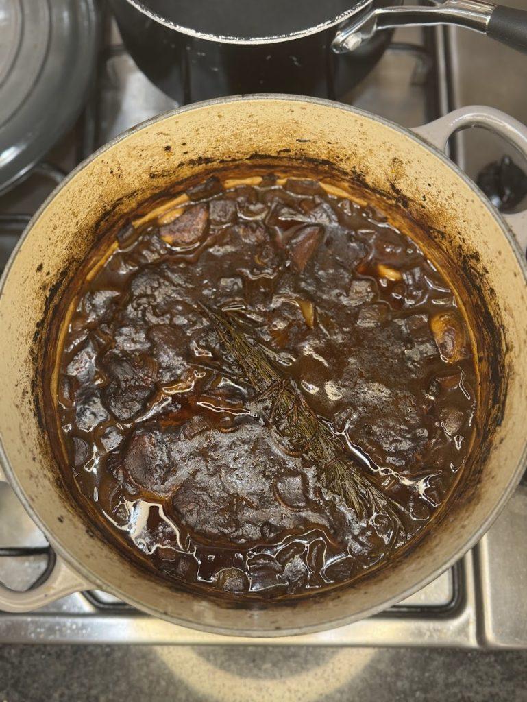 - Remove from the oven and gently remove the beef pieces, trying not to let the break apart too much. Strain the sauce to remove all the vegetables and herbs and add it back into the pot. Put the beef back in and cook on a medium low heat for a further 15 minutes to let the sauce gently reduce and the beef to stay hot.