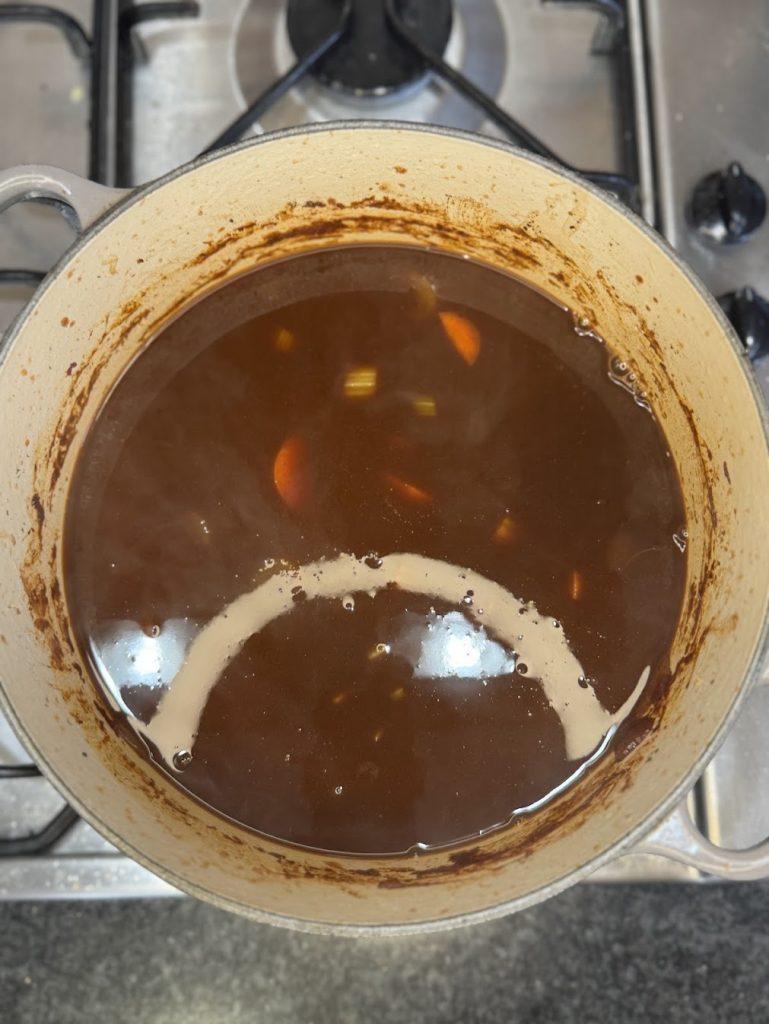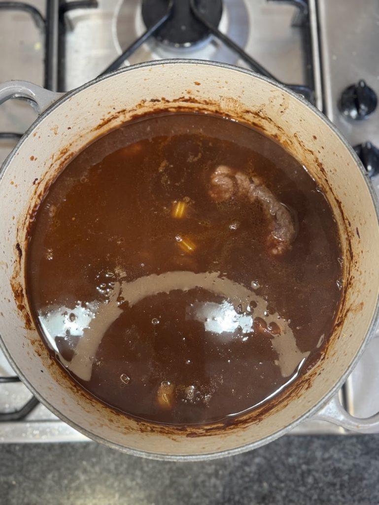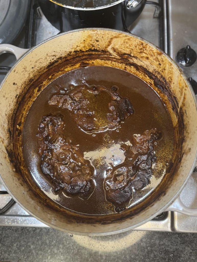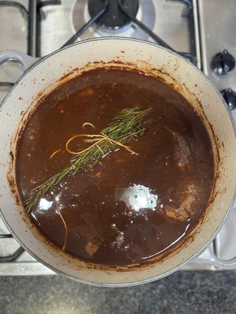 - Add the beef stock in and mix well. Bring it up to heat and then place the beef shin pieces in with the bouquet garni and any juices from the beef. Ensure they are covered and put the lid on the pot and place it in the oven undisturbed for 5 hours.