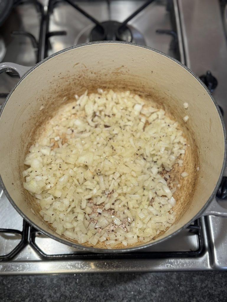- Reduce the heat to medium. Dice the onion and add to the pot. Cook for 5 or so minutes, until soft and going a nice golden brown.