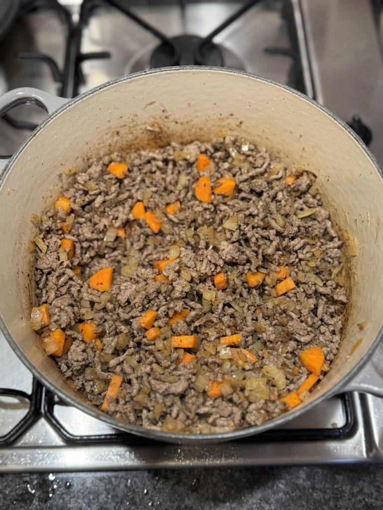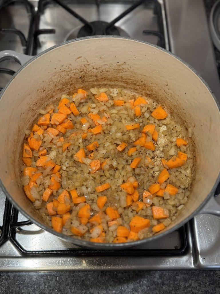- Roughly chop the carrots and add them to the pot. Cook for 2 minutes until starting to soften.