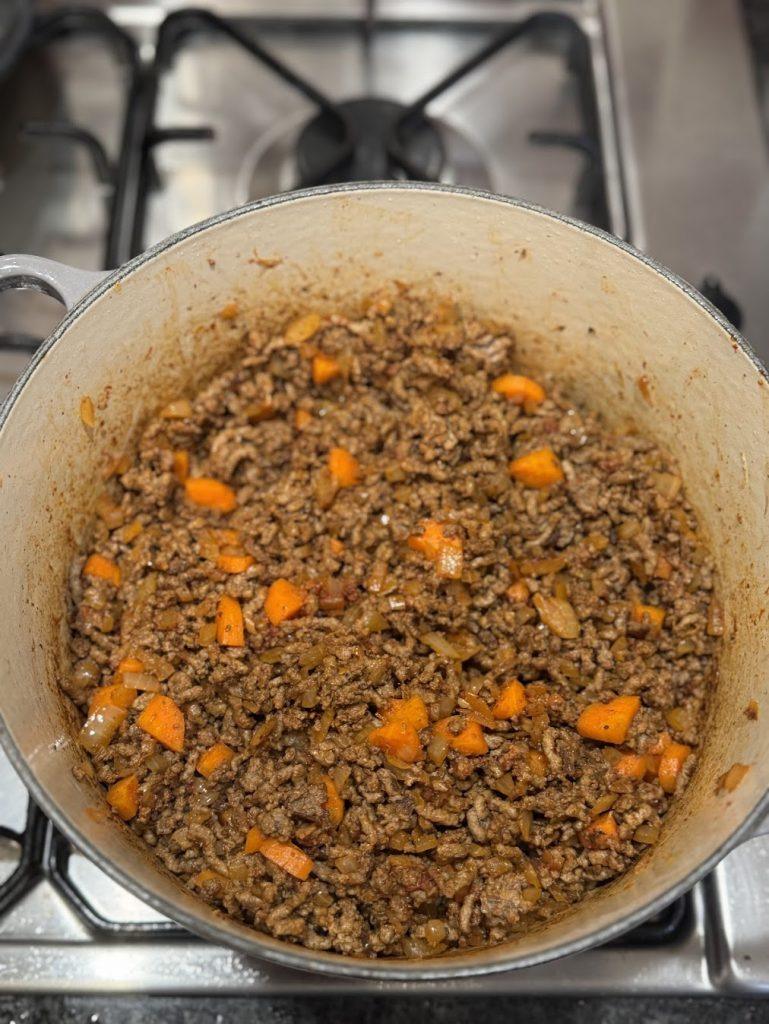 Beef mince is the base of course, and I add in onions, carrots and garlic. You can get a lot of flavour out of these by just investing some time. Cook the beef off first on it’s own in batches. This allows it to not just cook but really brown and sear. This is where the flavour is! The onions should then be cooked down for a while too. This allows them to develop some sweetness and deep savouriness.