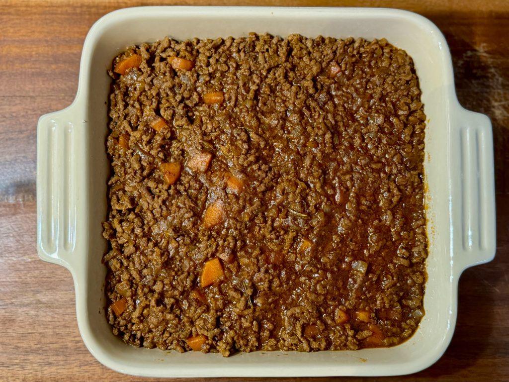 The mash in my recipe is mostly standard, but I do make one change. I add a bit of milk to stop the mash from going dry and grainy while baking. To stop this from then going too runny, I add an egg yoke to give it structure!