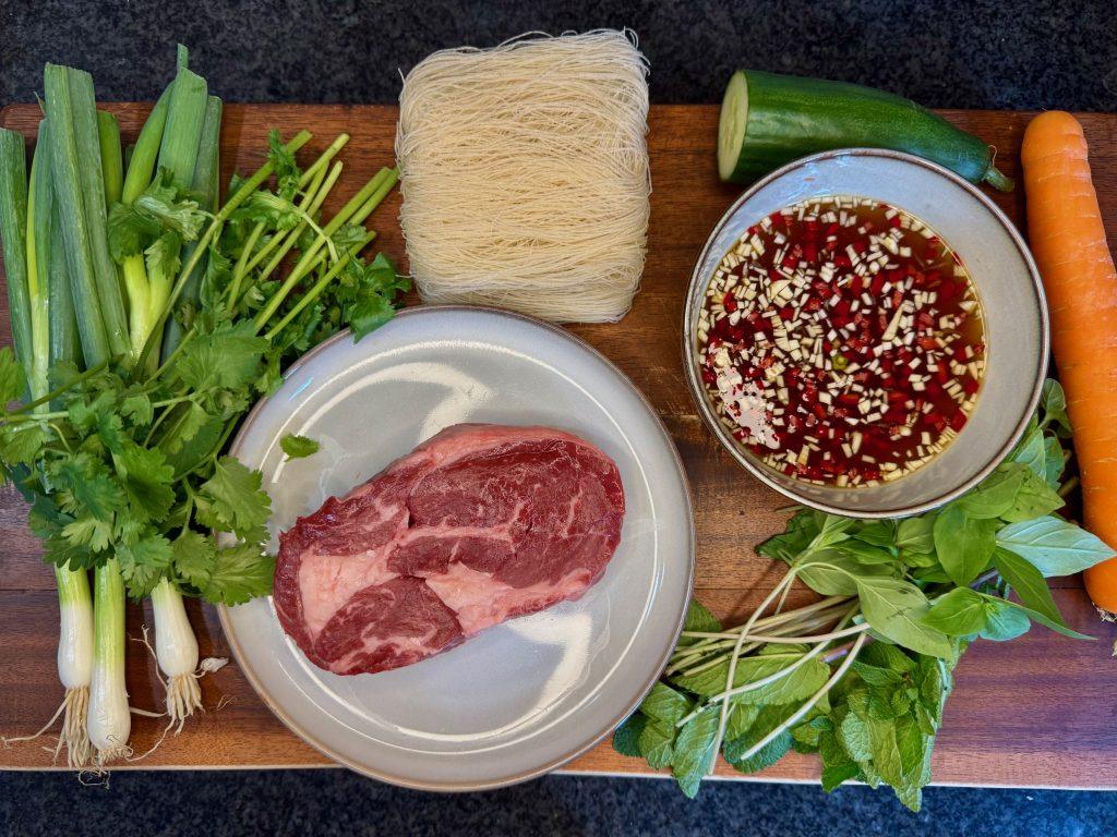 Bún thịt nướng is reaasonably labour intensive end to end, and I wanted to rustle up something quick that captured the flavour and vibe. This then draws on a few key elements, using the nước chấm as a dressing and using the fress veg and herbs. I have substituted the grilled pork skewers for a steak because it can be cooked on the hob. The pork skewers benefit most from being cooked over coals. Cooking a good steak is also one of life’s greatest pleasures.